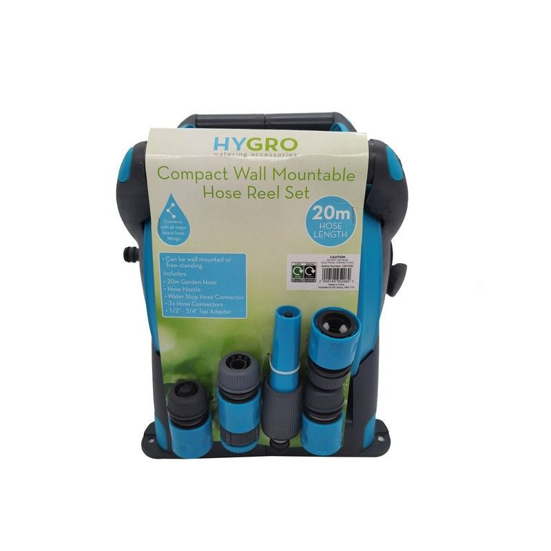 A high-quality garden hose set comprising a durable 20 metre hose, nozzle, three hose connectors and a tap adaptor that adjusts from a half to three quarter inch. Ideal for any watering task including garden irrigation and car washing. The portable free standing reel allows the hose to be stored away neatly when not in use. Also supplied with a wall-mounting bracket. The three snap-fit connectors are compatible with all major brand hose fittings.