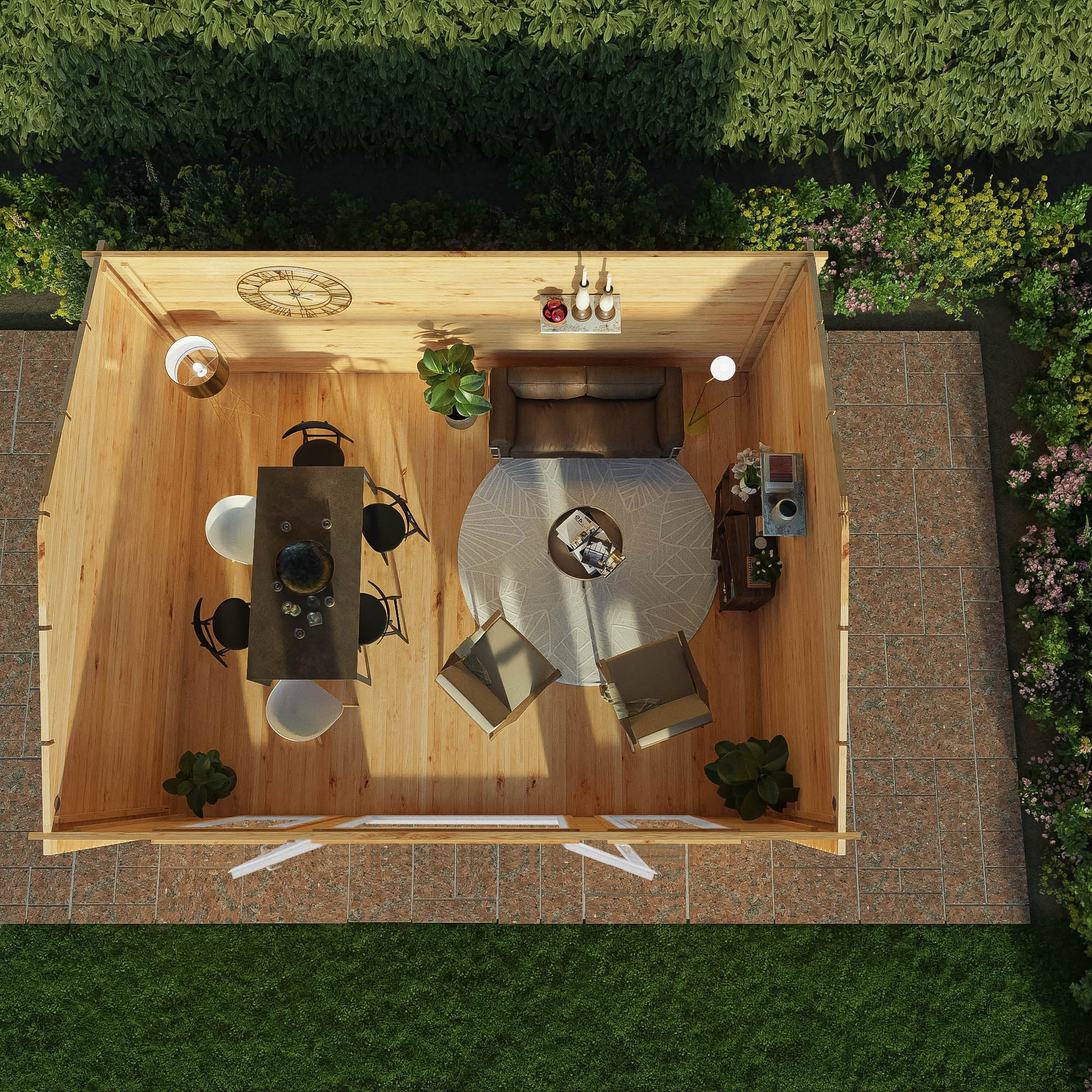 The Home Office Studio 5m x 4m Log Cabin is a vast, open and welcoming garden building. Perfect for those looking to extend their living space within the home. Boasting a large floor area, this building would make the perfect home office or gym studio, or perhaps somewhere you can sit back and relax. With an impressive set of large front windows and wide opening double full length windowed doors, this cabin provides panoramic views of the garden, creating the perfect garden getaway. Featuring a high apex roofline, you’ll find this building provides generous headroom inside, ideal for installing ceilings lights, tall storage or wall mounted pictures and artwork.