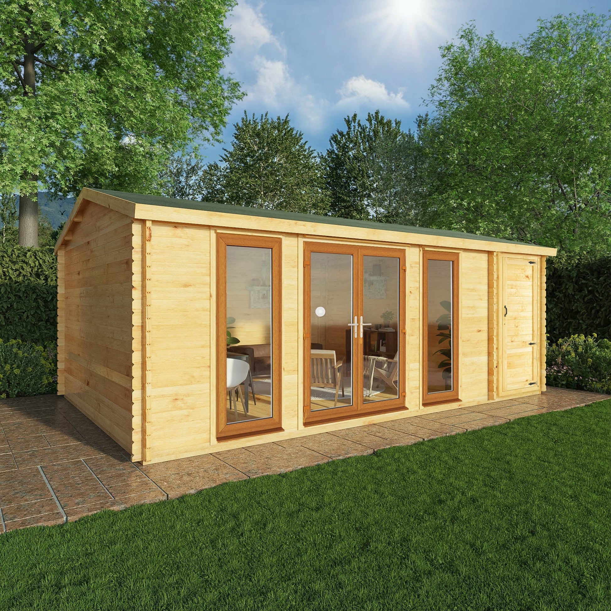 The 6.1 x 4m Home Office Studio Log Cabin is a vast, open and welcoming garden building. Perfect for those looking to extend their living space within the home. Boasting a large floor area, this building would make the perfect home office or gym studio, or perhaps somewhere you can sit back and relax. With an impressive set of large front windows and wide opening double full length windowed doors, this cabin provides panoramic views of the garden, creating the perfect garden getaway. Featuring a high apex roofline, you’ll find this building provides generous headroom inside, ideal for installing ceilings lights, tall storage or wall mounted pictures and artwork.